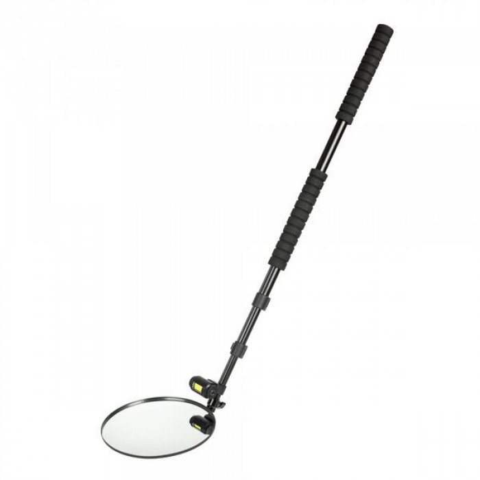 Инспекционное зеркало на телескопической (раздвижной) штанге, оснащенное встроенным осветителем. предназначено для визуального контроля труднодоступных мест, скрытых полостей и предметов, непосредственный осмотр которых затруднен или не возможен в силу их расположения: на коротком расстоянии от земли, между стационарными конструкциями или выше роста человека. Широкий угол поворота зеркала позволяет произвести всесторонний осмотр. Штанга из профилированного алюминия обеспечивает малый вес и высокую прочность. Ударопрочная конструкция подзеркальника с ребрами жесткости обеспечивает долгий срок службы. Широкий диапазон телескопической конструкции позволяет работать в труднодоступных местах. Мягкая и эргономичная ручка на штанге обеспечивает комфортную эксплуатацию. Освещение в стандартной комплектации – это влагостойкий светодиодный фонарь с высокой яркостью, на кронштейне.